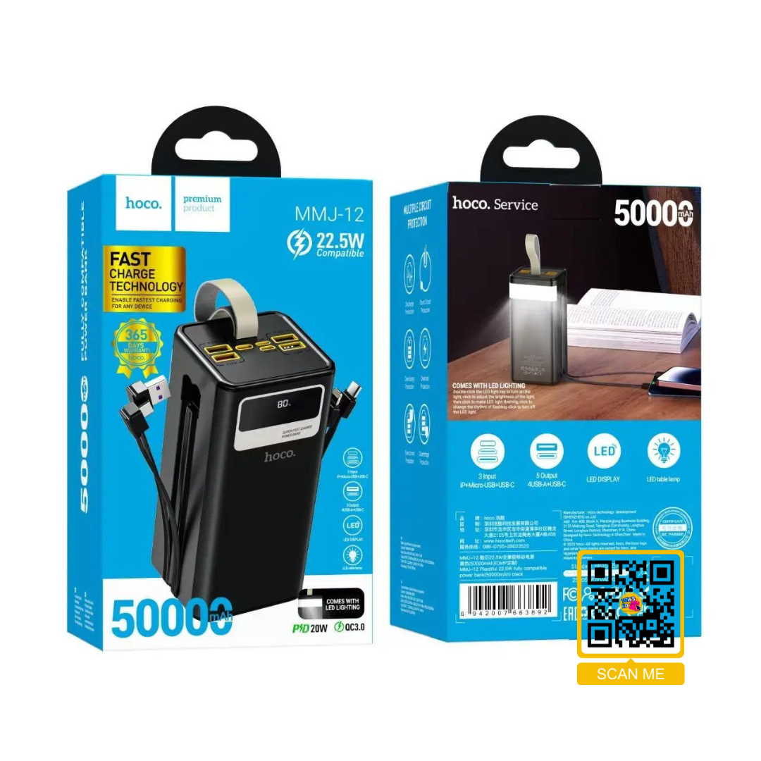 Stay powered all day with the Hoco MMJ-12 Power Bank, featuring a massive 50000mAh capacity and 22.5W fast charge technology. Designed with multi-port output (USB, Type-C, Micro) and an LED display, this premium Hoco device ensures your smartphones, tablets, and gadgets never run out of power. With built-in LED light and multi-circuit protection, the MMJ-12 is your perfect power companion for travel, work, or outdoor adventures.
