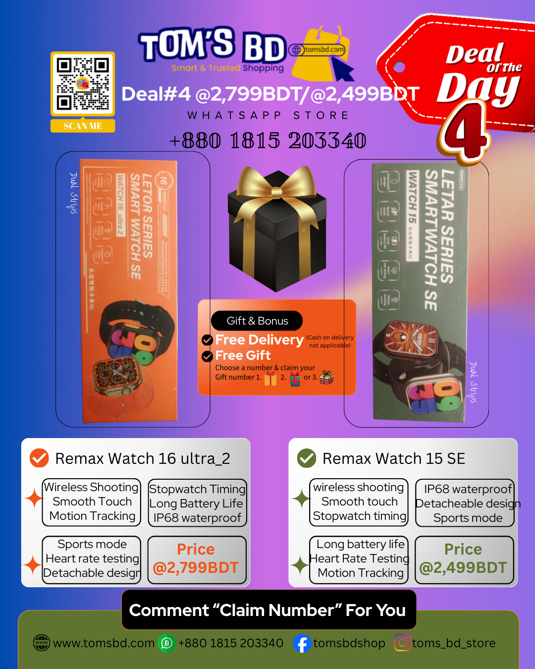 টম’স BD নিয়ে এসেছে 𝔻𝕖𝕒𝕝 #𝟜 – Premium স্মার্ট ওয়াচ প্যাক। যারা স্টাইলিশ ডিজাইন, হাই কনফিগারেশন আর বাজেট ফ্রেন্ডলি প্রাইসে স্মার্ট ওয়াচ খুঁজছেন, তাদের জন্য এই প্যাক পারফেক্ট চয়েস। এখানে থাকছে জনপ্রিয় Smart Watch Remax 16 এবং Smart Watch Remax 15SE – দুইটাই ট্রেন্ডিং মডেল, ডেইলি ইউজ এবং ফিটনেস ট্র্যাকিংয়ের জন্য একদম উপযুক্ত।